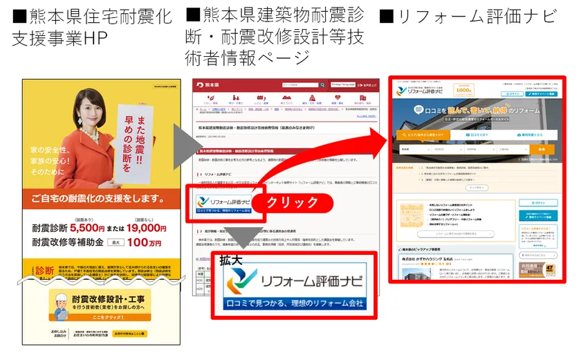現在では、県民に向けて用意している「熊本県住宅耐震化支援事業ホームページ」や「熊本県建築物耐震診断・耐震改修設計等技術者情報ページ」の中で、耐震診断・耐震改修を行う事業者を探せるサイトとして、「リフォーム評価ナビ」がまず第一に紹介されています。
