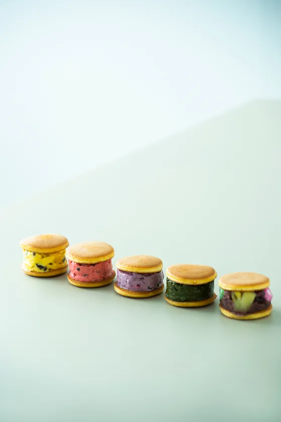 一つ一つ表情の違う、個性豊かな“味”を楽しんでいただくために、フレーバーの要になる「果汁などの材料」と「バタークリーム」の配合を何度も何度も繰り返し研究し、風味と色のベストマッチを探し出しました。たとえば、matchaは抹茶粉を8%配合し、よくある抹茶風味のお菓子よりしっかりと抹茶の苦味と風味を感じられるフレーバーに仕上がっています。口の中に広がる名前やカラーに負けない、本格的な香りや味を是非、楽しんでください。
