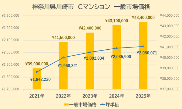 Cマンションの一般市場価格・坪単価の推移は上記【図5】の通りです。
