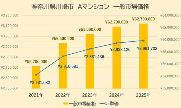 Aマンションの一般市場価格・坪単価の推移は上記【図3】の通りです。