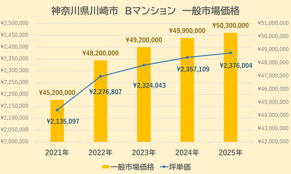 Bマンションの一般市場価格・坪単価の推移は上記【図4】の通りです。