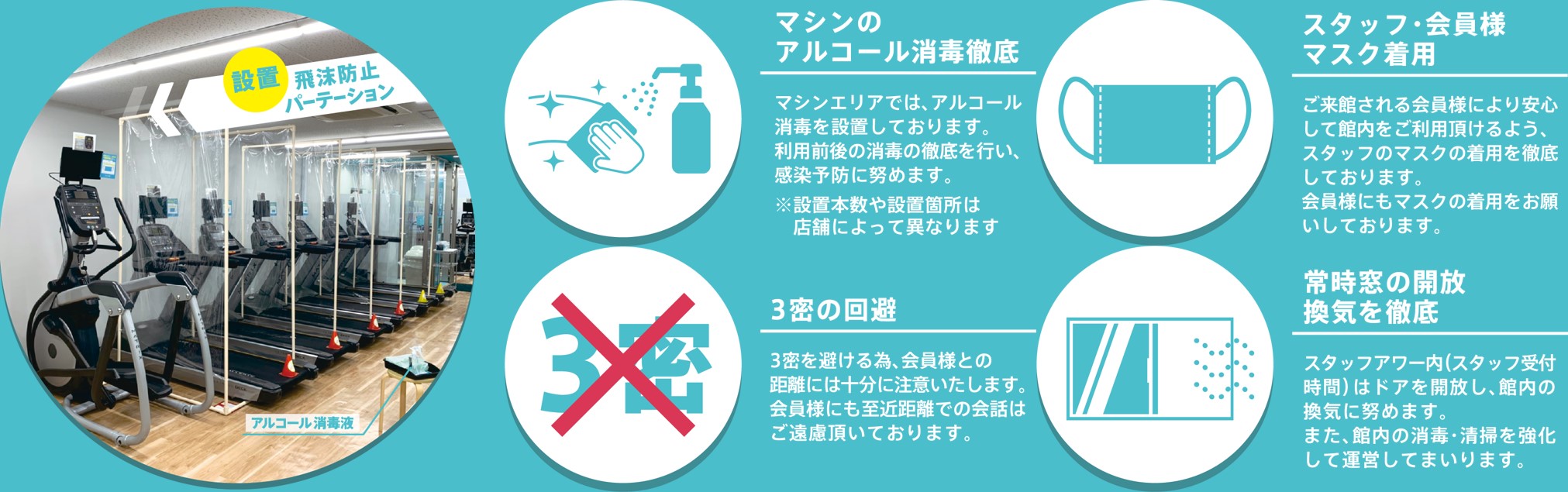 新型コロナウイルス感染症予防対策として、3密回避の基本を徹底するとともに、マシンのアルコール消毒の徹底やスタッフ・会員様のマスク着用、POPでの注意喚起、ランニングマシンの間にパーテーションを設置するなど、積極的に取り組んでおります。