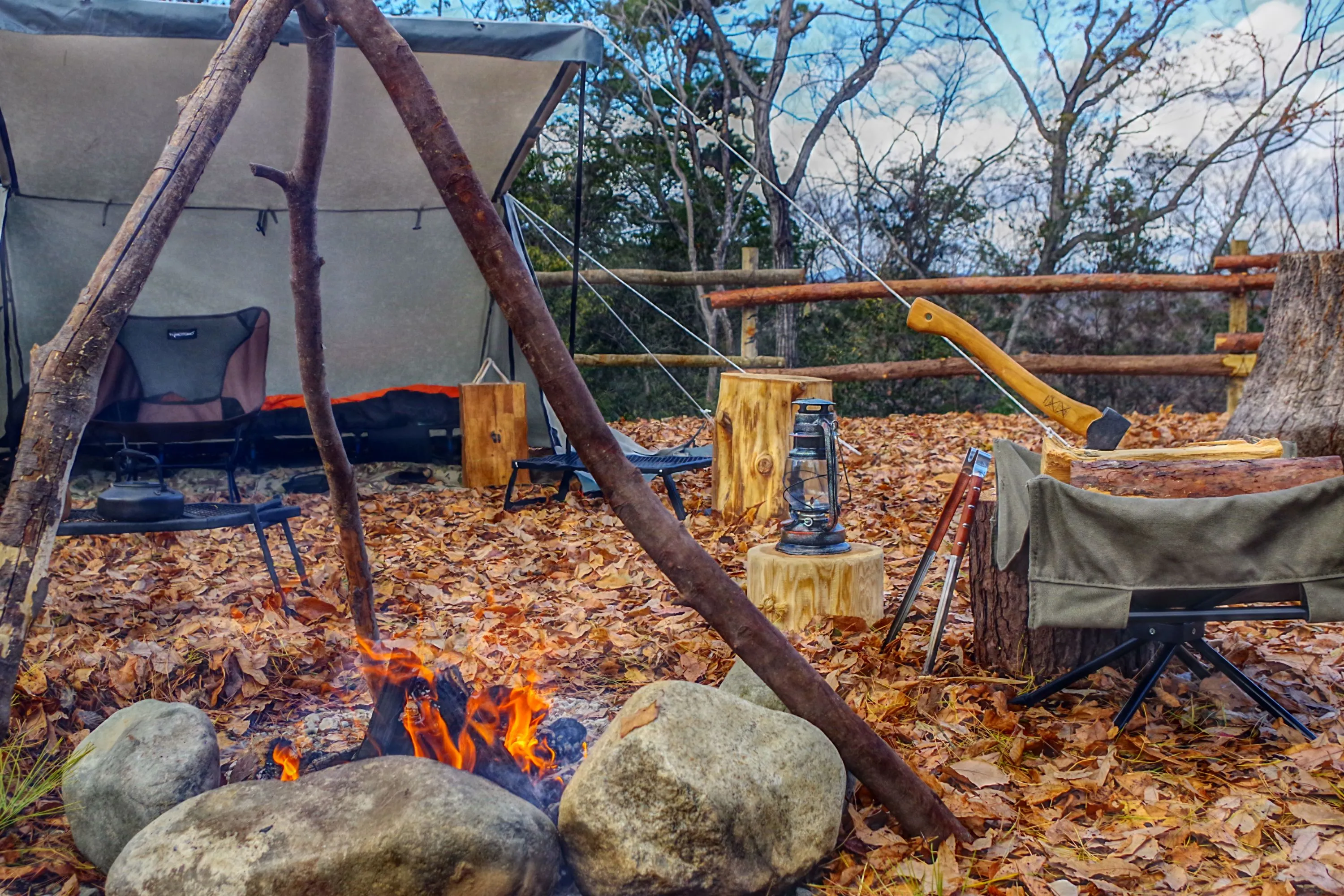 ▲完全直火OK!フリーサイト内の丸太や倒木を自由に使用して、マイフィールドを展開できる