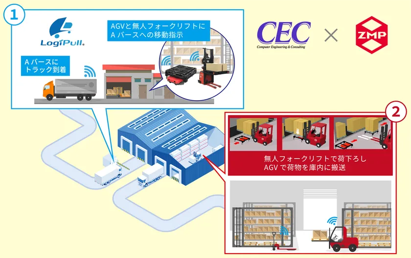 株式会社シーイーシー(本社:東京都渋谷区、代表取締役社長:大石 仁史、以下 シーイーシー)と株式会社ZMP(東京都文京区、代表取締役社長:谷口 恒)は、「LogiPull(R)(ロジプル)」のバース管理システムと物流支援ロボットのCarriRo(R)シリーズを連携した新サービスの開発で協業しました。今後両社は物流現場の人手不足解消のため、ICTを活用した省人化や自動化に向けた共同開発に取り組み、随時サービスを提供していきます。