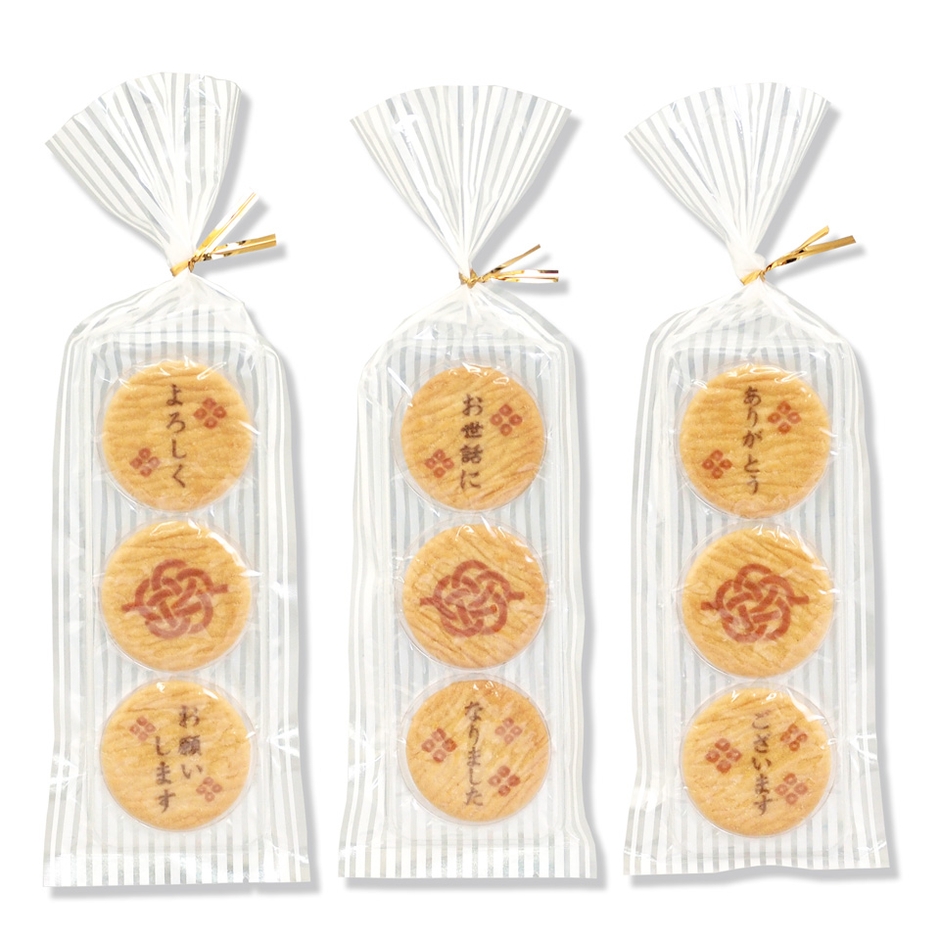 ご挨拶バタークッキー。7種類のメッセージが天然着色でフードプリントされた、プチギフトに便利なメッセージお菓子。
