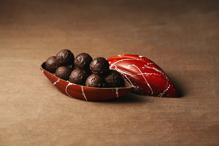 マスカットのような爽やかな香りが特徴のハーブ“エルダーフラワー”のゼリーを甘口のワイン“ミュスカ”のガナッシュで包んだボンボンショコラ。甘い物が得意でない方にもお勧めの程よい甘さ、そしてフルーティーな香りとなめらかな口どけが特徴です。チョコレートで作ったカカオの実を模した器に入れてご用意いたします。