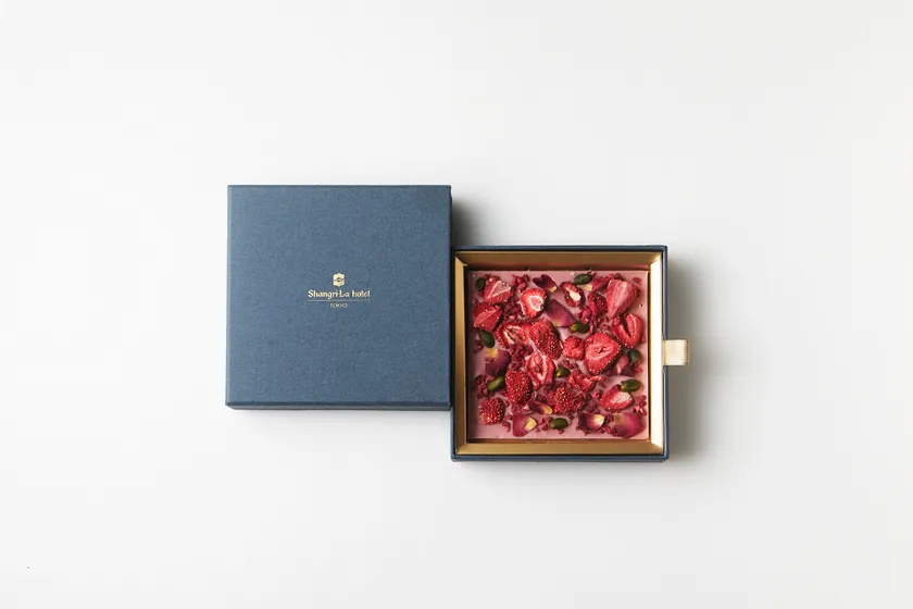 フルーティーな酸味のルビーチョコレートに、真っ赤な苺や花びら、ピスタチオをトッピング。自然のピンク色が可愛らしい女性におすすめのチョコレートです。オリジナルボックス入りはフラワーボックスのような見た目でより一層華やかな仕上がりです。