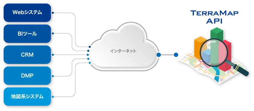 TerraMap APIとは、エリアマーケティングデータ(統計データ、ポリゴン、住所)を自社で用意せずに自社システムに組み込みたい方向けの地図システム開発支援Web APIです。
