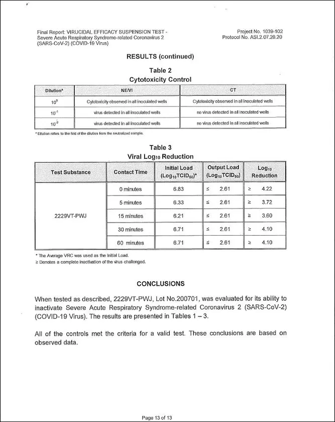 表中の結果の通り、開始0分後で、検出限界以下の数値まで新型コロナウイルスが不活性化しております。