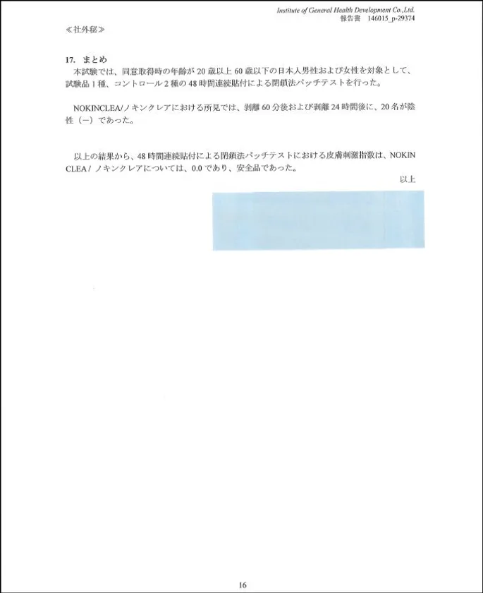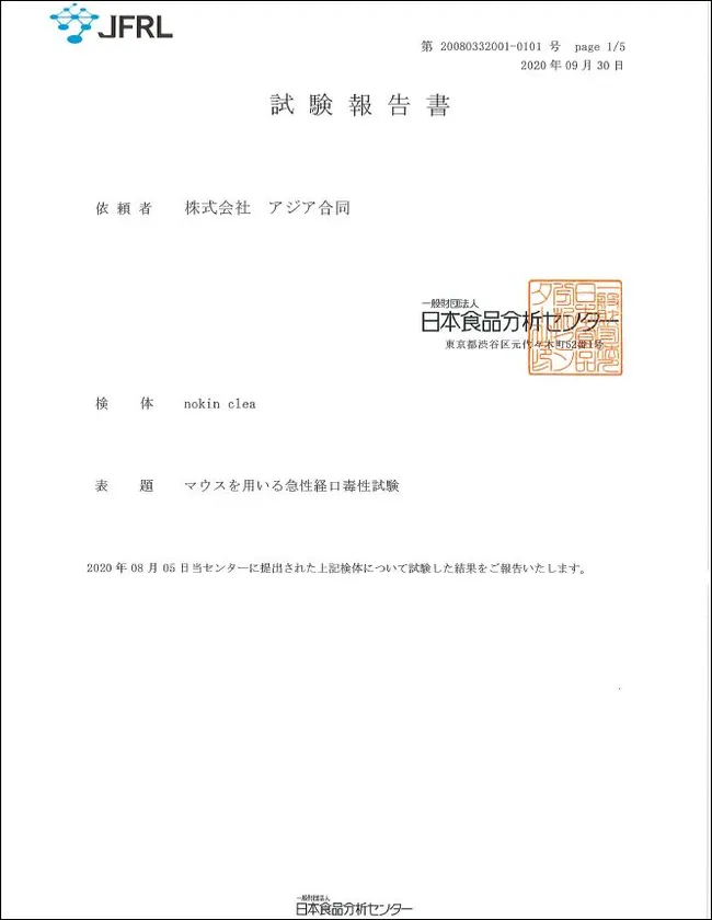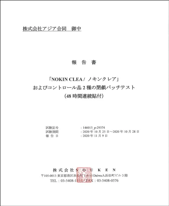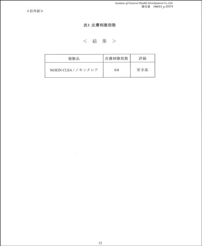 この「NOKIN clea new」の経口毒性値は、LD50が2,000mg/kg以上であることが確認できており(日本食品分析センター調べ)、肌パッチテストでも皮膚刺激指数0.0(安全品)の評価をいただいている(株式会社SOUKEN調べ)、安心安全に配慮した製品になっております。
