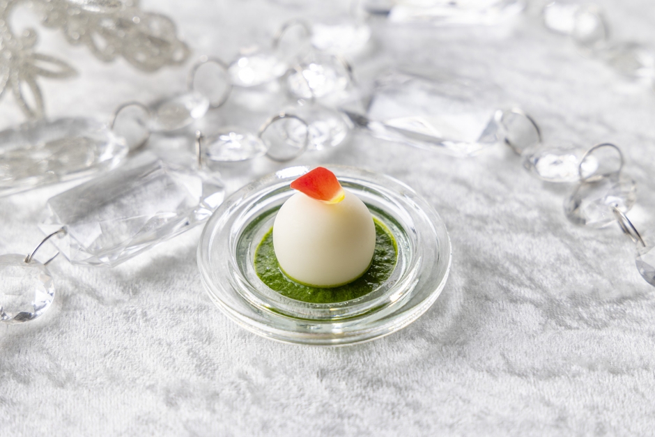 カブの優しい甘みとまろやかな口溶けが楽しめるブランマンジェです。なめらかな舌触りの一口サイズのブランマンジェの下には、鮮やかな緑のほうれん草ソース。トップに添えた赤い花びらがアクセントとなり、緑・白・赤のコントラストが美しい一品です。