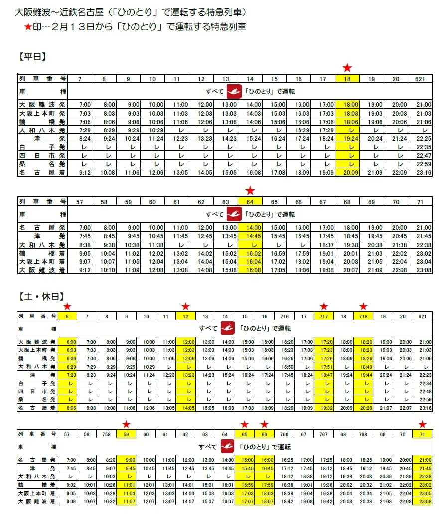(大阪難波 18時発、近鉄名古屋 14時発)