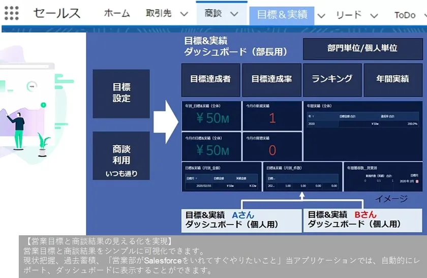 SalesforceのThe Model「集客から商談・クローズ、カスタマーサクセスに至るまでの各段階で情報を可視化・数値化し、部門を越えた連携を軸に売上の増大を図っていく考え方」に基づき、商談・クローズ段階の初期値である「営業目標と商談実績」にクローズアップ。素早く把握することができ、多くの営業部が望んでいた機能です。