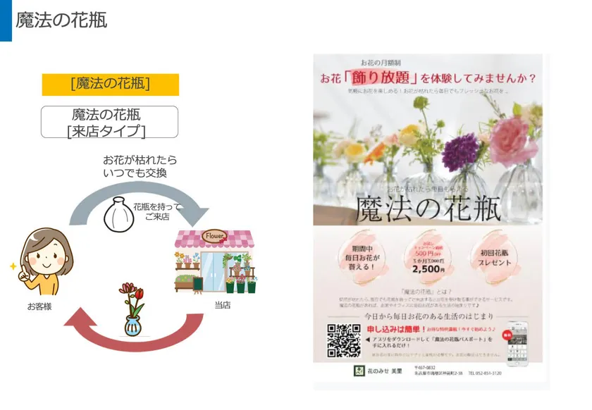 急速に広がる定額制(サブスクリプション)ですが、「お花と緑の定額制サービス」を実現し、今まで近隣のお客様をメインに「毎日でもお花がもらえる」をコンセプトに『魔法の花瓶』を2020年2月よりご提供してまいりました。花の顧客管理システム会社などと協力して考案し、現在は全国の80店舗が参加しています。「気軽に来店してもらえるようにしたかった」想いが、サービス開始当初は約20人でしたが、コロナ禍の中で急増し、現在は270人以上に上ります。