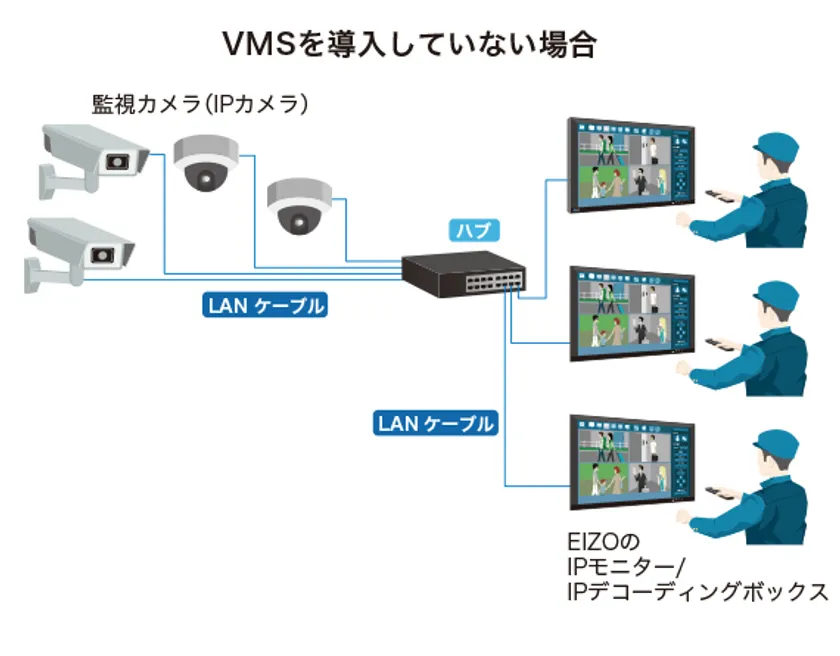 VMSは、複数の監視カメラを設置する中大規模施設での監視業務を効率化するために必要なソフトウェアです。VMSを導入していない場合、監視カメラや表示モニターの設定や操作は、それぞれの設置場所にて行う必要があります。