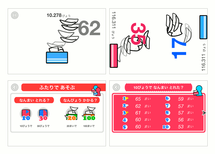 「ティッシュ」は、画面上の箱から指でティッシュペーパーを引っ張り出すだけのシンプルなゲームで、時間と枚数を競う2つのルール(計4種類)で楽しむことができます。また、1台のスマートフォンだけで2人同時にゲームを遊ぶことができる、画面分割による対戦機能も搭載いたしました。家族や友人がスマートフォンをお持ちでなくとも、一緒にゲームを楽しむことができます。また、iPadでご利用の場合、4人での同時対戦にも対応しております。この機能により、家族の団らんやパーティー・合コンなど、これからお付き合いの多くなる季節に皆様でお楽しみ頂けます。また、当社のゲームソーシャルプラットフォーム「ココゲー」*との連携により、「ティッシュ」のユーザー同士で対戦する機能も将来アップデートで対応いたします。
