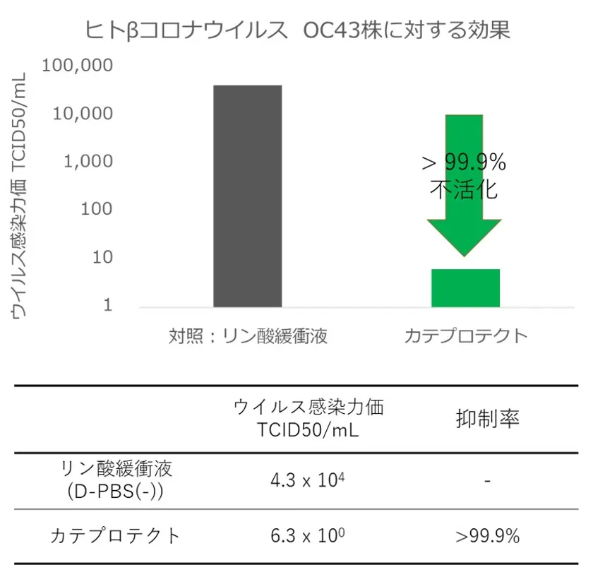 カテプロテクトは新型コロナウイルスを含む複数株のヒトコロナウイルスに対して99%以上の抗ウイルス活性を示した。複数株のヒトコロナウイルスへも効果を示しているため、異なる変異株に対しても効果が期待される。