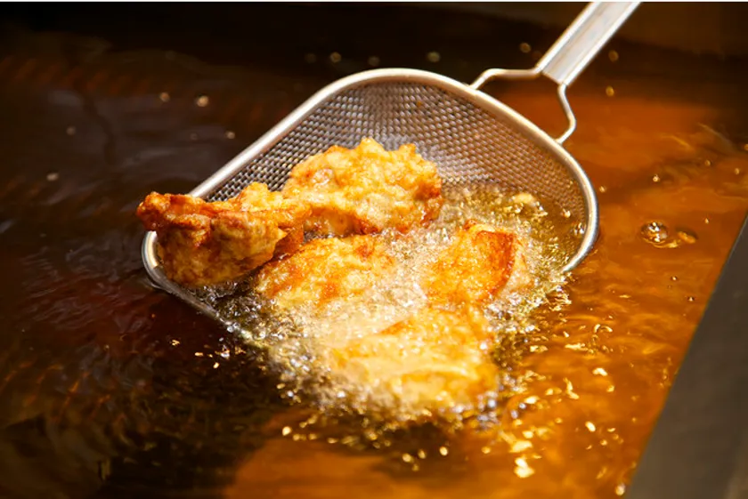 秘伝のしょうゆダレにしっかりと漬け込み、独自製法で揚げています。