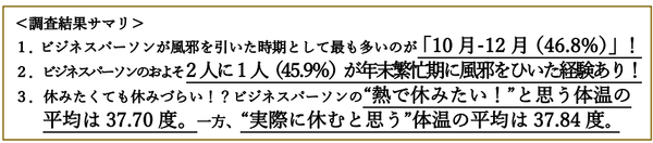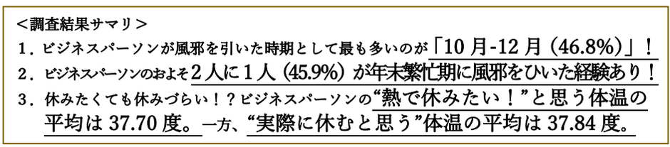 第一弾となる今回は、年末の風邪症状の実態と共に、そもそもビジネスパーソンが「熱で休みたい!」と感じる体温を調査しました。その結果から、“休みたい”と思う体温は37.7度、実際に“仕事を休む”体温は37.8度ということがわかりました。発熱時はしっかりとした療養が必要にも関わらず、忙しいビジネスパーソン故、なかなか休みづらいという状況が垣間見えました。