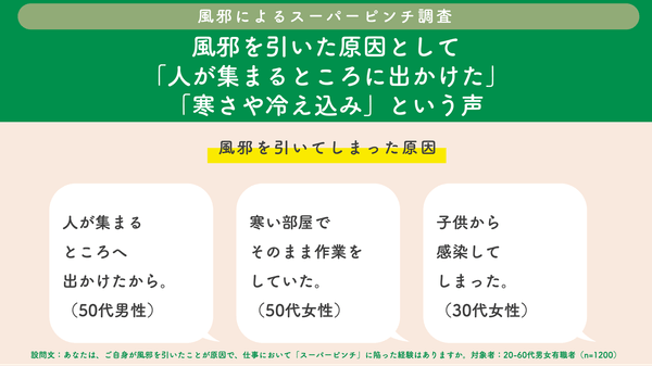 ビジネスパーソン1,200名(20-60代男女有職者)に、直近1年で風邪を引いたと感じた時期について伺った所、最も多かったのが「10-12月(46.8%)」。次いで「1-3月(44.8%)」と、冬シーズン中でも年末年始を跨いで風邪を引いてしまうことが多いようです。そんな風邪を引いてしまった原因をFAで伺ったところ、「人が集まるところに出かけた」「寒さや冷え込み」という声や、「子供から風邪をもらってしまった」という声も見られました。
