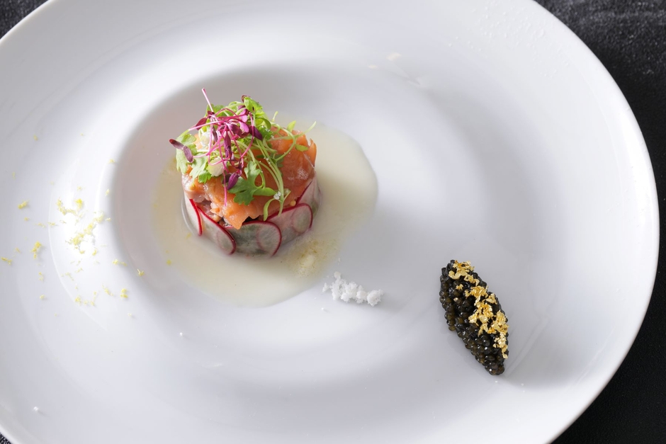 ・冷前菜:渥美サーモンのマリネ 柚子とキャビアのコンディメント