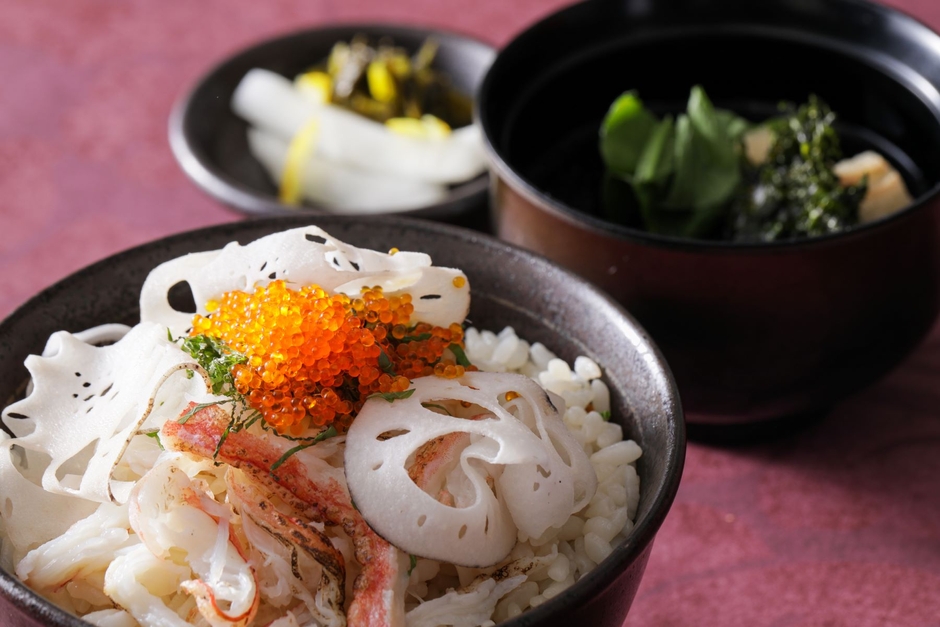 ・季節の炒め御飯:ズワイ蟹と蓮根と生姜の炒め御飯 とびこのアクセント/赤出汁と香の物