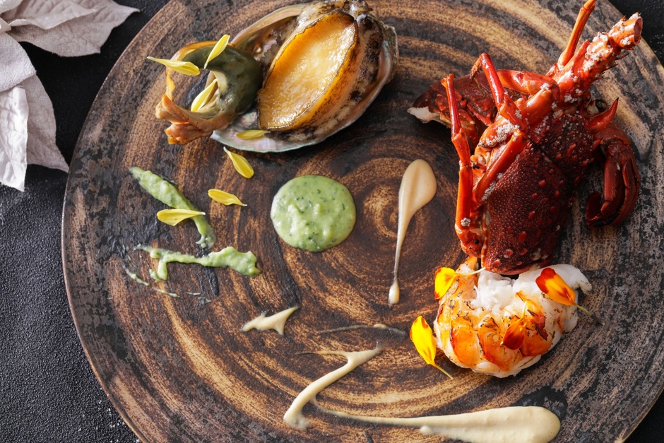 ・魚料理:伊勢海老と鮑のグリル 2色のソースで