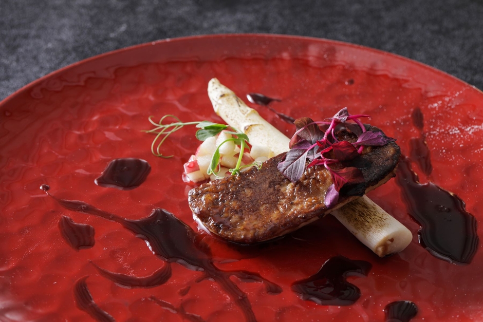 ・温前菜:フォアグラのポアレ 林檎のコンポート 黒トリュフのソース