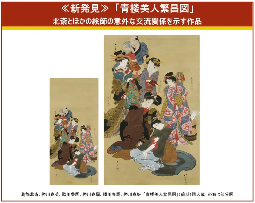 ▲≪新発見≫葛飾北斎、勝川春英、歌川豊国、勝川春扇、勝川春周、勝川春好「青楼美人繁昌図」(前期)個人蔵 葛飾北斎が、勝川春好、勝川春英など4名の勝川派絵師たち、そして歌川豊国とともに遊郭の女性たちと太鼓持ちを描いた作品で、北斎とほかの絵師の意外な交流関係を示す作品です。