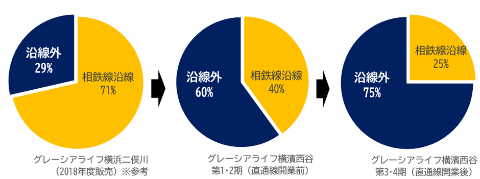 その結果、ご購入者さまの総数に占める沿線外の方の割合は、2018年度に相鉄不動産が二俣川駅近くで販売した「グレーシアライフ横浜二俣川」では、約30%であったのに対し、同物件は、第1・2期(2019年1月~11月まで)で60%、第3・4期(2020年2月~11月まで)で75%と、大きく増加しました。