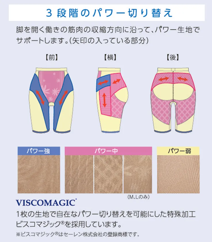 3段階のパワー生地を使用することで、内転筋上部に負荷をかけて骨盤底筋を鍛えるサポートをします。
