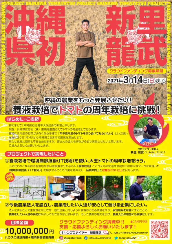 沖縄県出身、現在兵庫の農園で農業研修中で2021年4月から独立して沖縄県うるま市にて農業を開始予定の新里龍武(しんざと たつむ)は、夏場に県内産の野菜が少なくなる沖縄で「年中県内産の野菜を作り食べてもらいたい」という想いを胸に、クラウドファンディングサイトCAMPFIREにて沖縄県初(※)となる「養液栽培でトマトの周年栽培」に挑戦するプロジェクトをスタートしました。(※)本人調べ