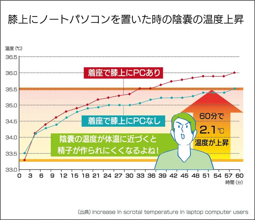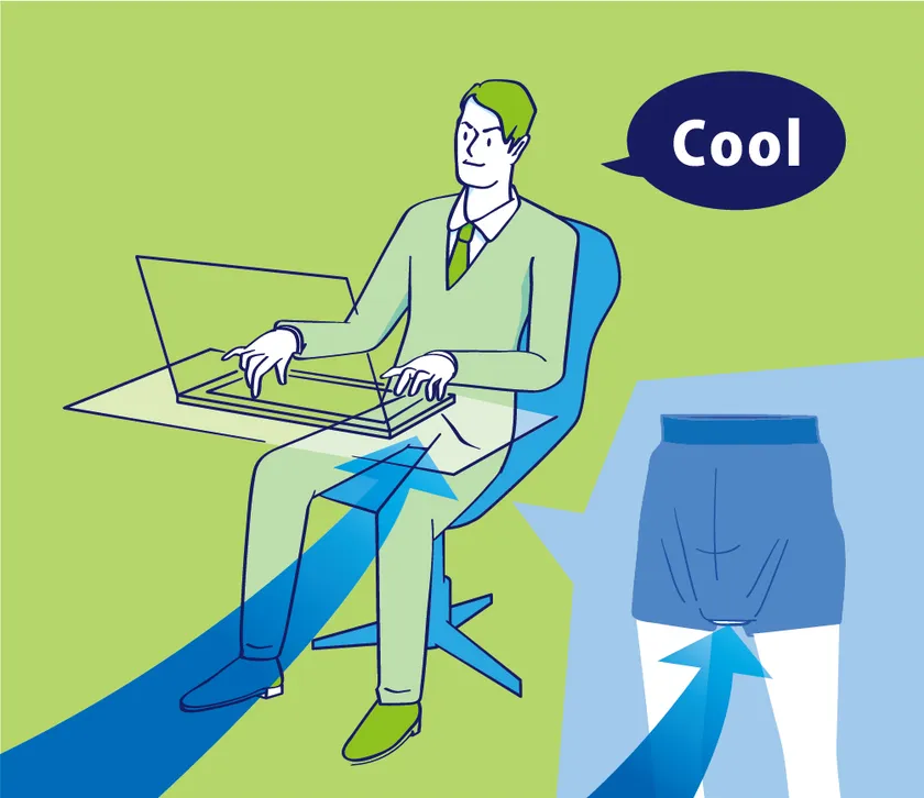 陰嚢が体の外にぶら下がっているのは精巣の温度を体温より低く保つためであり、精子を活発につくるには体温より2〜4℃低い温度が適切とされています。股間は常に涼しい環境であることが望ましいのですが、座っているだけでも1時間で陰嚢温度が2.1℃上昇するという研究データがあります。