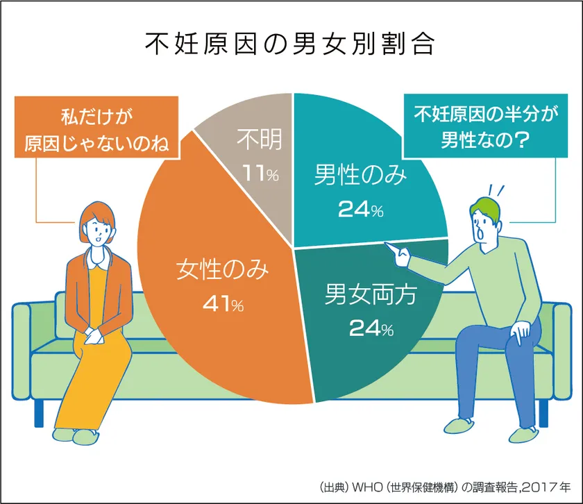 妊活において男性の不妊原因はあまり議論されてきませんでした。そのため男性不妊についての認知や啓蒙はまだまだ不十分です。妊活における男性の現状について図解やグラフでご紹介します。