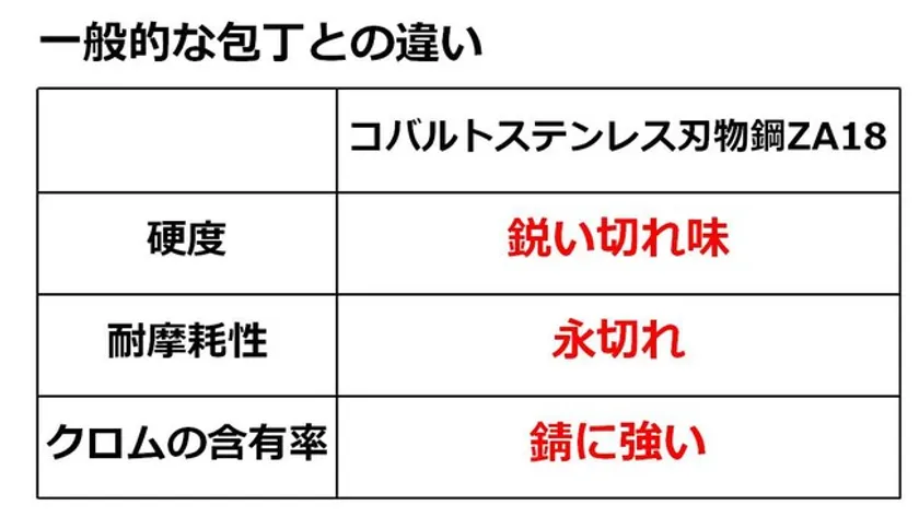 コバルトステンレス刃物鋼ZA18は硬度が高く、耐摩耗性に優れているので、切れ味抜群で永切れ(長続き)します。ほかの刃物鋼に比べてクロムの含有率が高く、不錆性能において特にすぐれています。