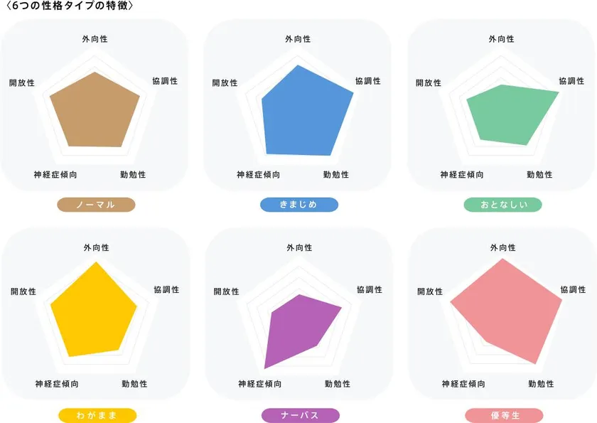 ▼[Big5理論]を用いた性格特性分析により、対象者の性格を6つのタイプ、「ノーマル」「きまじめ」「大人しい」「わがまま」「ナーバス」「優等生」に分類