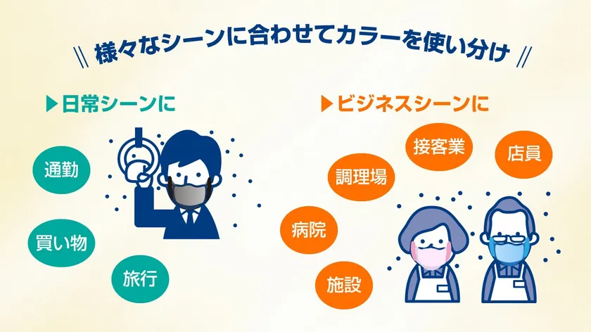 日常での通勤や買い物時などでのカラーの使い分け、接客や企業や病院、施設など担当や部署などでのカラーの使い分けをされています。