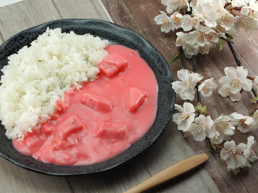 華やかなさくら色のルーに、風味付けに桜の花びら(加工)を配合。ココナッツミルクの風味とバターのコクが生きる「ホワイトカレー」がベースとなっております。味はまろやかな辛さの中辛に仕上げ、具材は大きめにカットした国産ジャガイモと人参を使用。パスタやパンにも最適な味付けです。