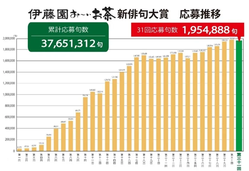 「伊藤園お~いお茶新俳句大賞」は、日常の暮らしの中で感じたことや思ったことを、季語や定型にこだわることなく、五・七・五のリズムにのせてのびのびと自由に表現でき、優秀作品が緑茶飲料「お~いお茶」のパッケージで発表されるコンテストとして1989年(平成元年)からスタート。前回は50万人を超える方々から200万句近い作品をご応募をいただき、累計応募句数が3,765万句を突破した日本一※の俳句コンテストです。