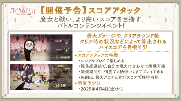 4月4日(金)12:00より、新バトルコンテンツイベント「スコアアタック」を開催予定です。魔女と戦い、より高いスコアを目指すバトルコンテンツとなっております。最大ダメージや、クリアラウンド数、クリア時の状況などによって算出されるハイスコアを目指しましょう。