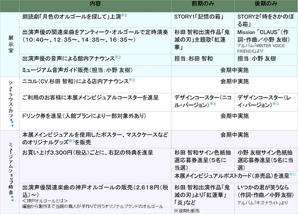 本展では、声優 杉田 智和(すぎた ともかず)、小野 友樹(おの ゆうき)が朗読する脚本「月色のオルゴールを探して」(脚本:三名 刺繍)に、アンティーク・オルゴールなどの自動演奏楽器の生演奏を交えて上演します。