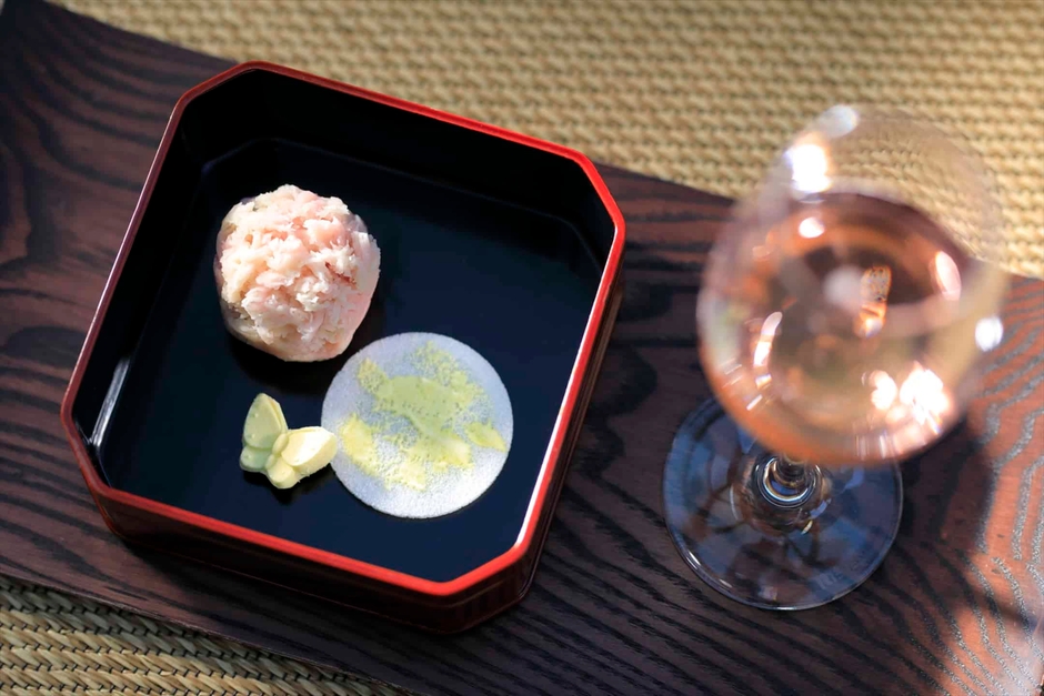 翡翠では、奥嵐山の桜を愛でながら和菓子とロゼスパークリングワインを味わいます。和菓子は、創業100余年の老舗和菓子店「有職菓子御調進所(ゆうそくがしごちょうしんじょ) 老松(おいまつ)」がこのアクティビティのために手掛けたものです。桜と霞(かすみ)がかった山を表現するため、目の細かい馬毛の網で裏ごしをした繊細なつくりのきんとんで、菓銘は「花の山」です。松尾芭蕉が嵐山の桜を詠んだ句「花の山二町のぼれば 大悲閣」にちなんでいます。添えているお干菓子は、春の花盛りの風情を表現した和三盆の蝶と菜の花の煎餅です。和菓子とロゼスパークリングワインを味わいながら、華やかな春の風情を楽しむことができます。