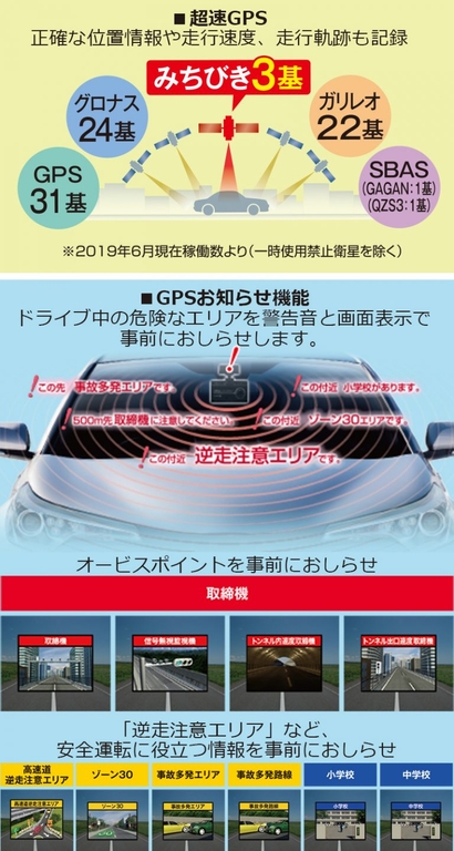 超速GPS採用! 自車位置や速度も記録【NEW】 安心のGPSおしらせ機能