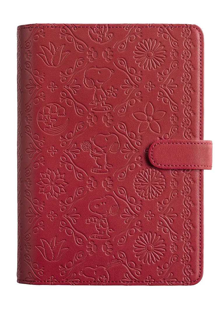 牛革ならではの高級感と元気な赤色、そして型押しで浮かび上がるスヌーピー&お花たち。
