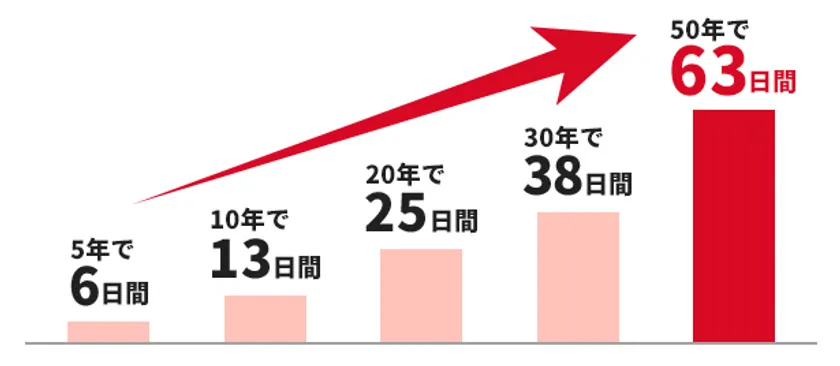 これは5年間で約6日間、10年間で約13日間、50年間で約63日間の時間となり、旅行に何度も行けてしまうほどの差が生まれます。