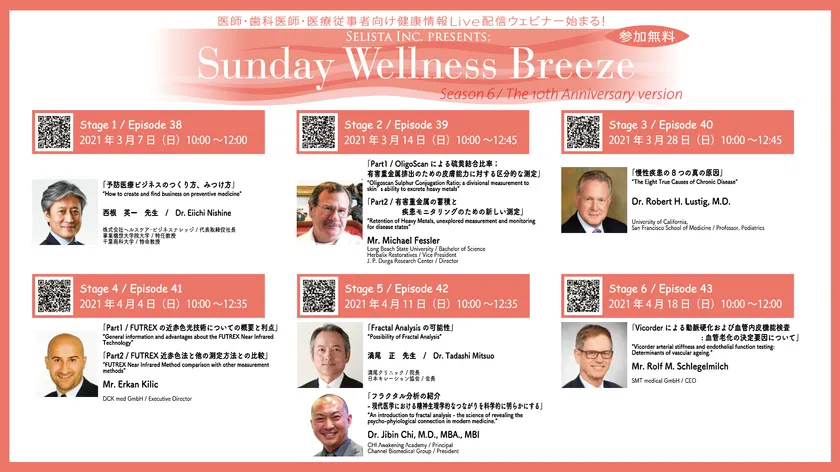 この度、Zoomによるウェビナー『Sunday Wellness Breeze, Season 6 The 10th Anniversary Version』を開催させて頂く運びとなりました。『Sunday Wellness Breeze』は日頃、抗加齢医療・予防医療・栄養療法に携わられている医師・歯科医師・薬剤師の先生方を対象に、爽やかな微風が心地よいゆったりとした日曜日の朝に、ブランチでも食べながら予防医療や抗加齢医療の最新情報を気軽な気持ちでご視聴頂ける医療のプロ向け無料健康情報Live配信ウェビナーで、1 Season 6 Stageでお届けしております。昨年の5月からスタートし、医師を中心に毎回300人近くが参加する人気のウェビナーです。