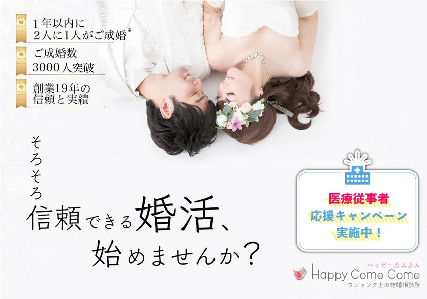 結婚相談所ハッピーカムカム(所在地:東京都港区)は、2021年1月18日(月)~2月末までの期間限定で、医療の現場で働く方々を対象に「医療従事者応援キャンペーン」を実施いたします。
