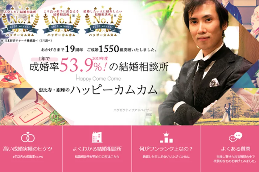 結婚相談所ハッピーカムカムは、2002年創業の老舗結婚相談所。創業以来のご成婚者数は、およそ3,100人を突破しました。年間の成婚率は53.9%、1年以内に登録会員の2人に1人が成婚を決めています。