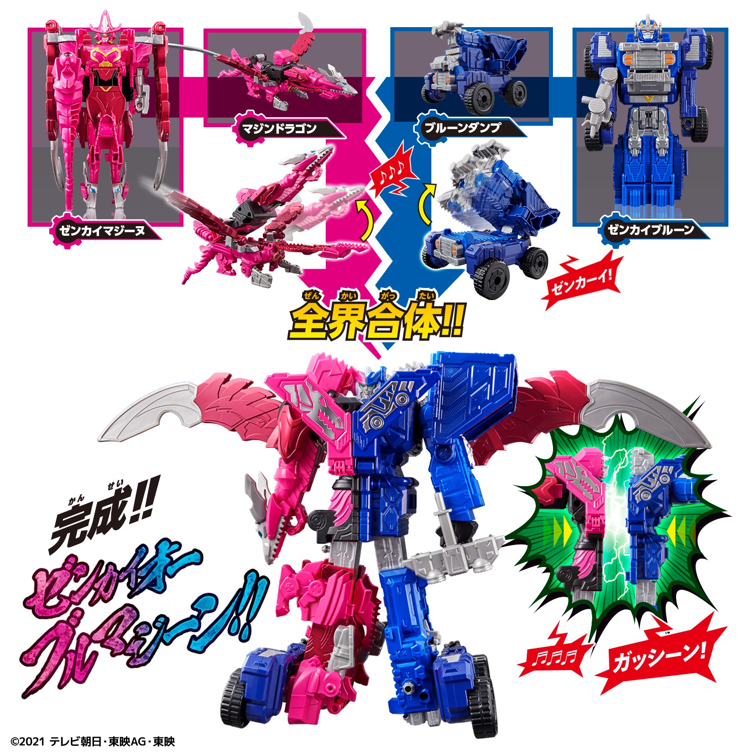 2体のロボヒーロー「ゼンカイマジーヌ」と「ゼンカイブルーン」のセットです。ゼンカイマジーヌがマジンドラゴンに、ゼンカイブルーンがブルーンダンプにそれぞれ変形します。また、ブルーンダンプのボディを大きく全開させることで番組の合体演出のサウンドが発動。マジンドラゴンと合体させると「ゼンカイオーブルマジーン」が完成します。また、別売りの『全界合体 DXゼンカイオー ジュラガオーンセット』と組み合わせて、4種の合体ロボに組み換え合体が可能です。