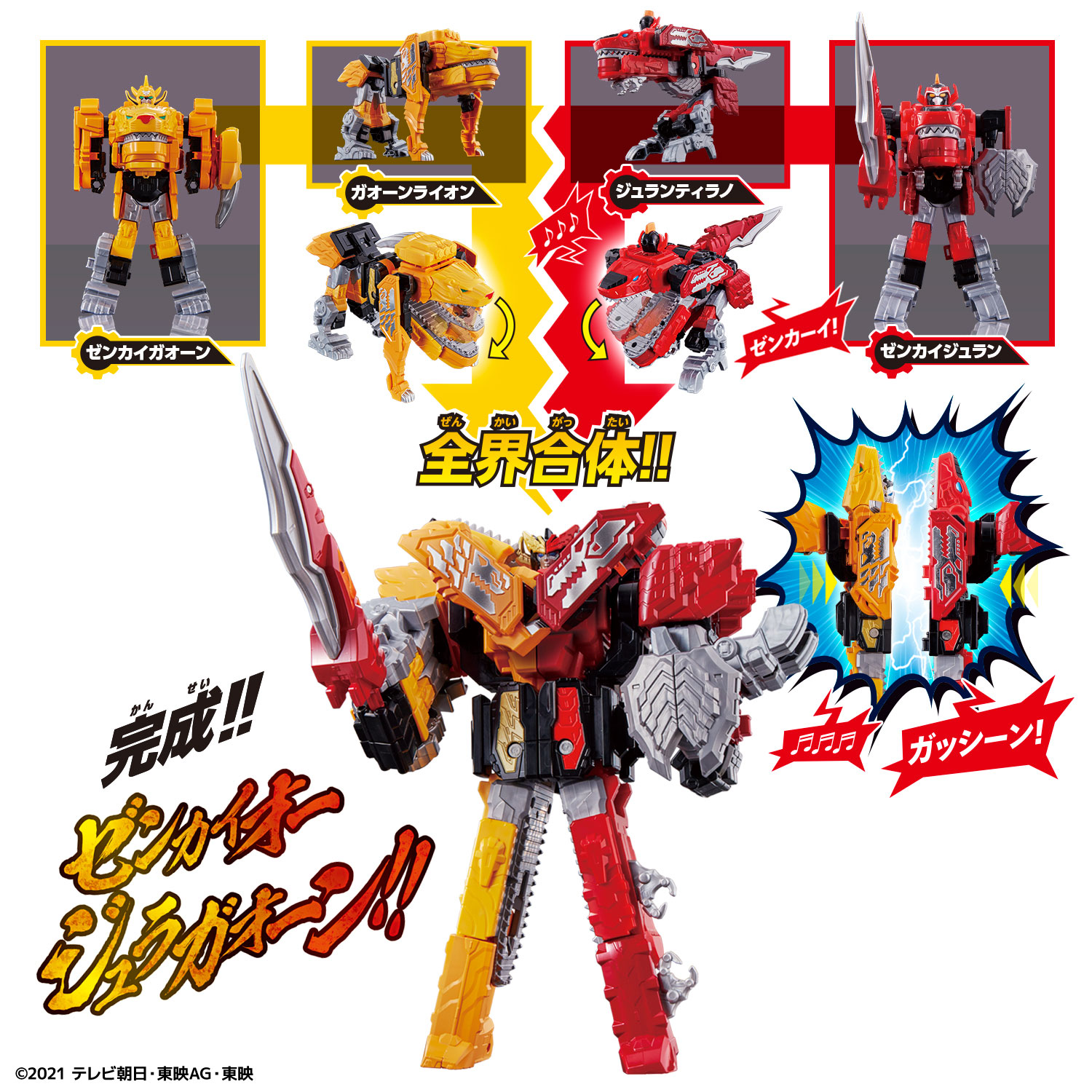 株式会社バンダイ アジアトイ戦略部は、スーパー戦隊シリーズ45作目となる新番組「機界戦隊ゼンカイジャー」(2021年3月7日~毎週日曜 午前9時30分よりテレビ朝日系)の放送に合わせ、変形・合体ロボット『全界合体 DXゼンカイオー ジュラガオーンセット』(7,480円・税10%込/6,800円・税抜)を、2021年3月6日(土)に発売します。主なターゲットは3~6才の未就学児で、全国の玩具店、百貨店・家電店・量販店の玩具売場、インターネット通販などを中心に販売します。1月15日15時より各種商品のネット予約も開始いたします。(発売元:株式会社バンダイ)